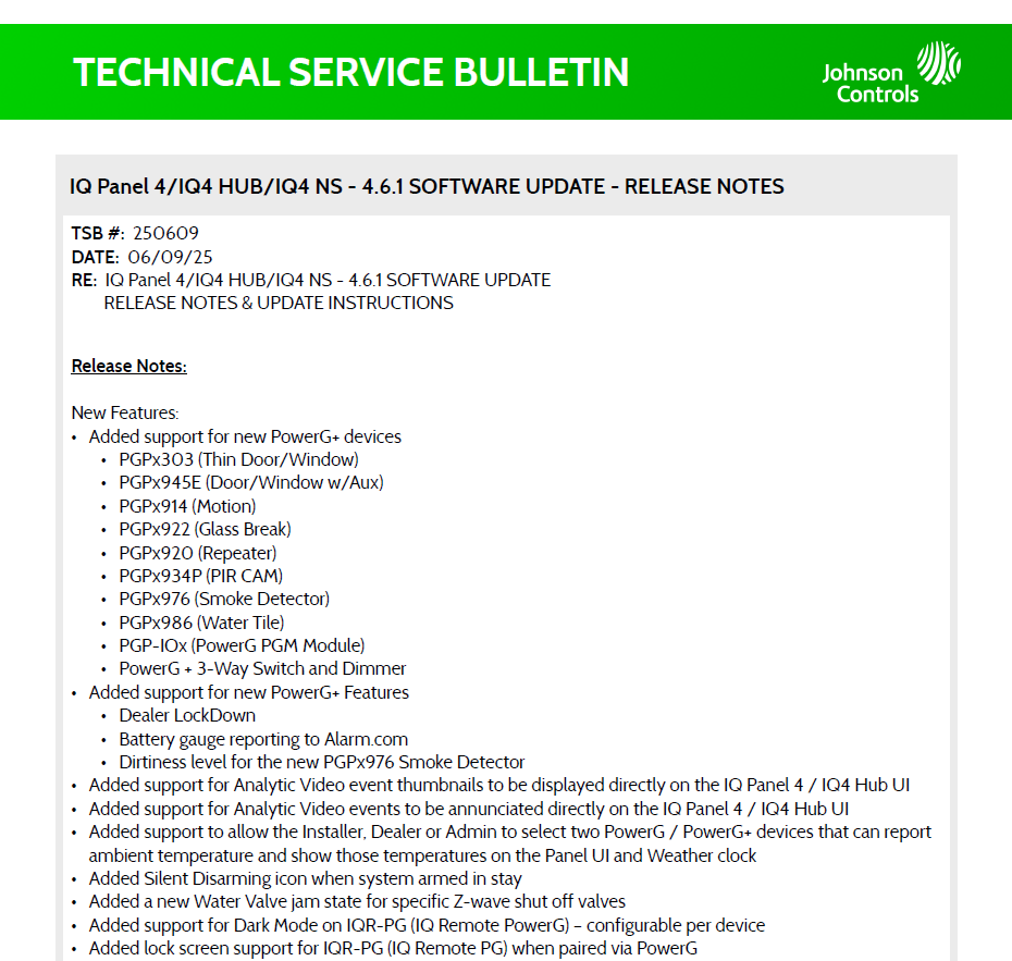 See the release notes and upgrade instructions for the latest IQ4 firmware - V4.6.1. Most notably, this update adds the PowerG+ capabilities. You can also download the PDF copy of the Technical Service Bulletin.